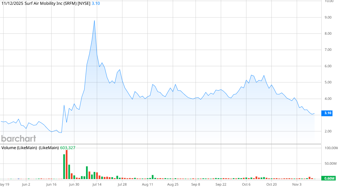 The stock has also been struggling this year as Surf Air seeks to gain traction. Shares are down 43% in 2025, falling to just $3 per share.