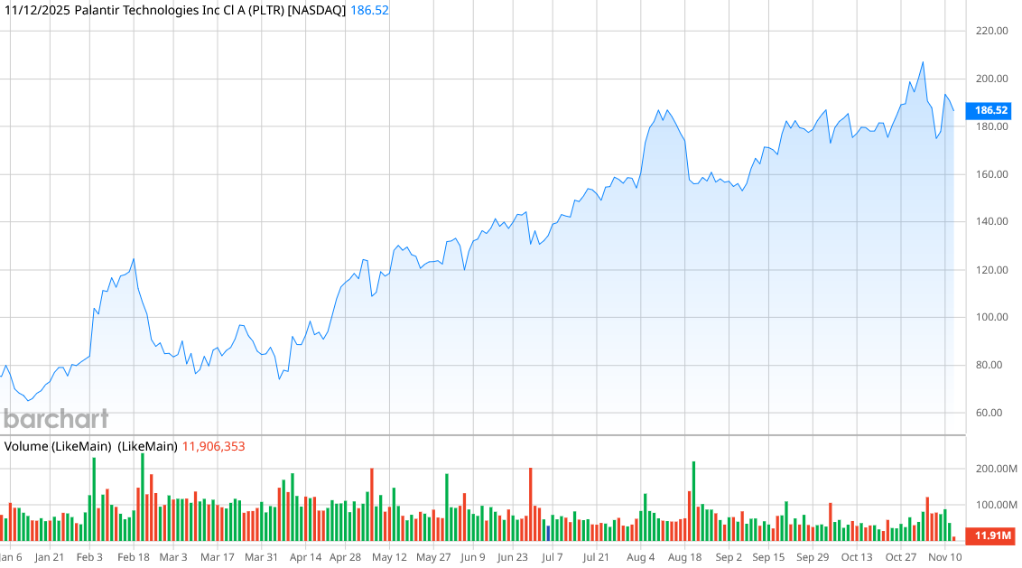 PLTR has been one of the hottest stocks in the stock market for the last two years, up 145% so far this year. It now sports a market capitalization of about $453 billion. Earnings in the third quarter showed gains of 63% on a year-over-year (YoY) basis to $1.18 billion. U.S. commercial revenue was up 121% to $397 million. U.S. government revenue was $486 million, increasing 52% from a year ago.