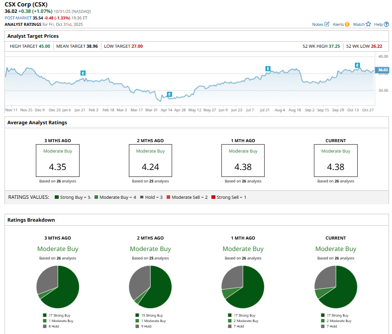 CSX’s mean price target of $38.96 suggests a modest 8.2% upside from current price levels, while the Street-high target of $45 represents a notable 24.9% premium.