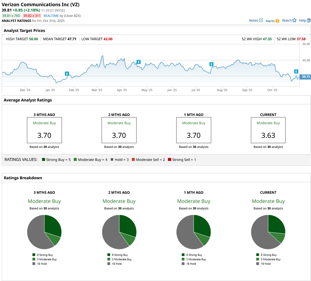 Overall, on Wall Street, Verizon stock is a “Moderate Buy.” Of the 30 analysts covering the stock, eight rate it a “Strong Buy,” three rate it a “Moderate Buy,” and 19 say it is a “Hold.” Its average target price of $48.06 suggests an upside potential of 21% over current levels. However, its high price target of $58 implies the stock can climb 46% over the next 12 months.