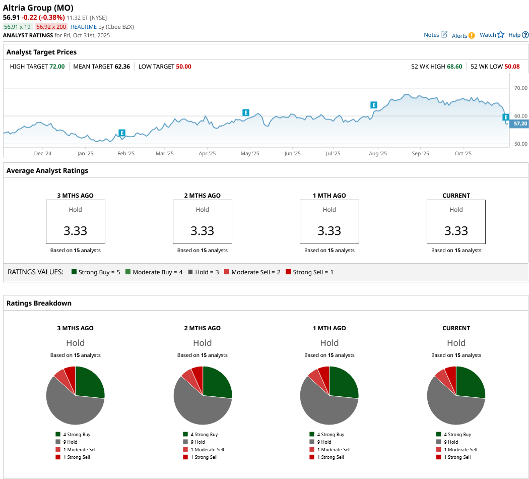 Overall, on Wall Street, Altria stock is a “Hold.” Of the 15 analysts covering the stock, four rate it a “Strong Buy,” nine rate it a “Hold,” one says it is a “Moderate Sell,” and one rates it a “Strong Sell.” Altria is trading about 10% short of its average target price of $62.36. However, its high price target of $72 implies the stock can climb 27% over the next 12 months.