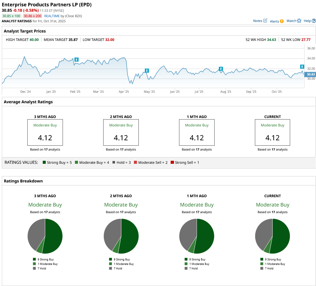 Overall, on Wall Street, EPD stock is a “Moderate Buy.” Of the 17 analysts covering the stock, nine rate it a “Strong Buy,” one rates it a “Moderate Buy,” and seven say it is a “Hold.” Its average target price of $35.87 suggests an upside potential of 16% over current levels. However, its high price target of $40 implies the stock can climb 30% over the next 12 months.