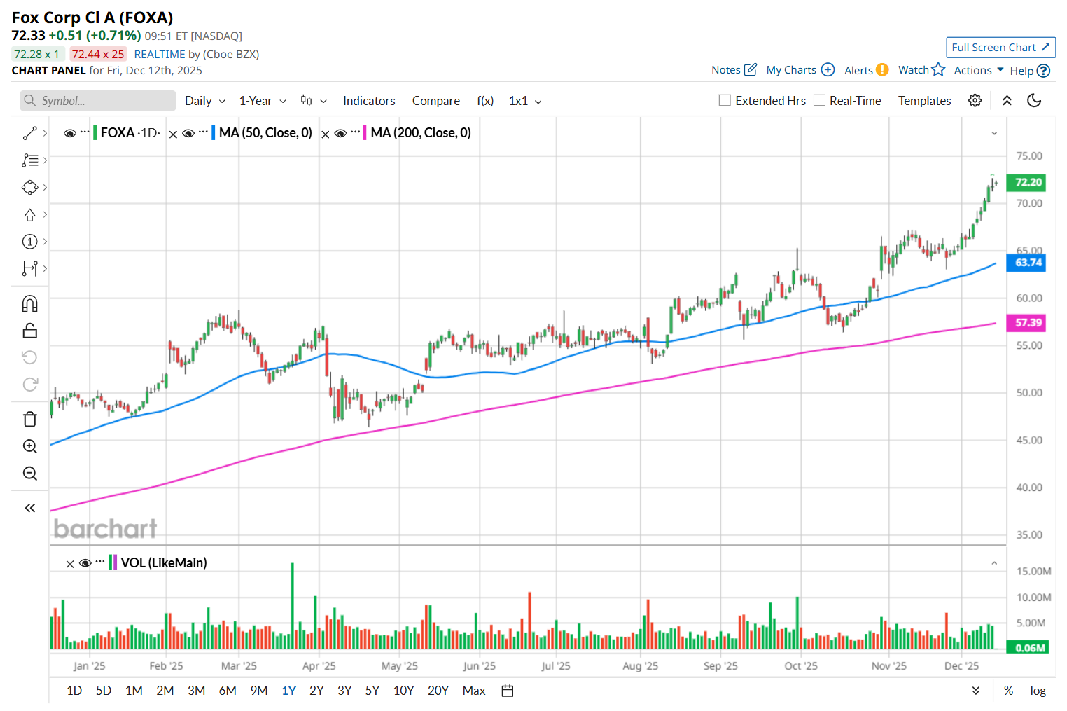 To confirm its bullish trend, FOXA has been trading above its 200-day moving average over the past year and has remained above its 50-day moving average since mid-May, with slight fluctuations.