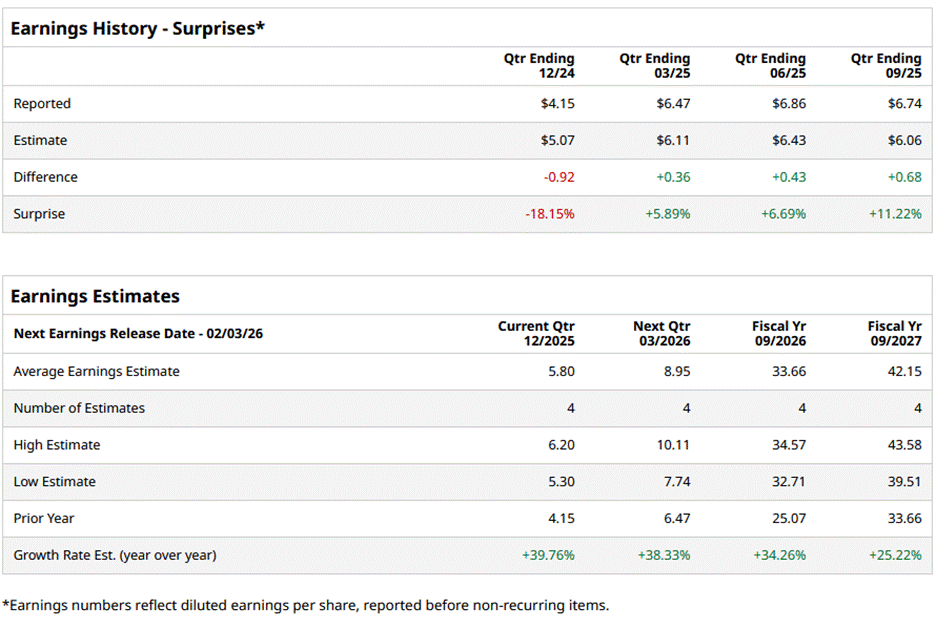 Founded in 1956, the Bozeman, Montana-based Fair Isaac Corporation (FICO) provides analytics software in the Americas and internationally. It develops analytic, software, and digital decisioning technologies and services that enable businesses to automate, enhance, and connect decisions. The company has a market capitalization of $39 billion and is expected to announce its fiscal first-quarter earnings for 2026 soon.