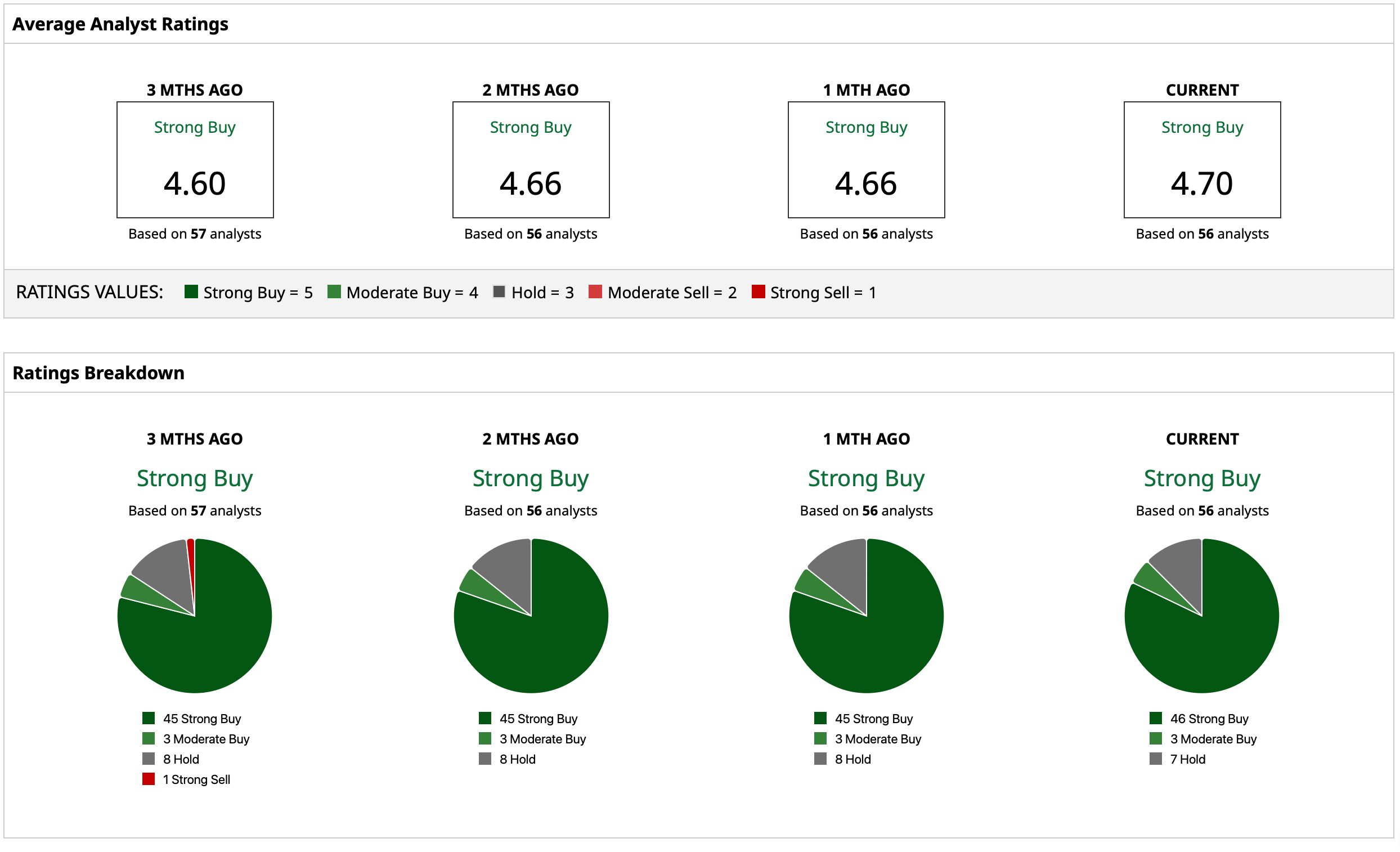 Analysts continue to remain bullish about META stock, attributing shares with a consensus rating of “Strong Buy” as well as a mean target price of $864.02. This denotes potential upside of about 34% from current levels. Out of 56 analysts covering Meta Platforms, 46 have a “Strong Buy” rating, three have a “Moderate Buy” rating, and seven have a “Hold” rating.