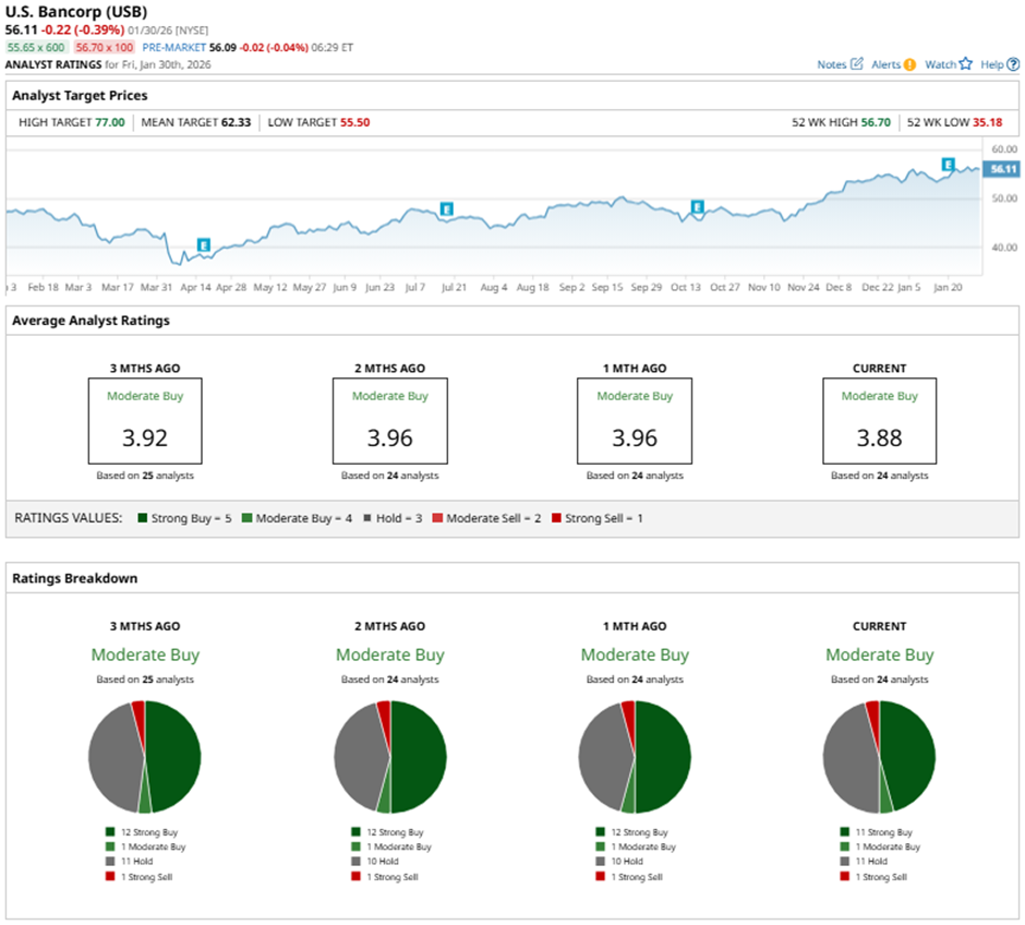 U.S. Bancorp released Q4 2025 results on Jan. 20. The company posted stronger-than-expected EPS of $1.26 and total revenue of $7.37 billion, supported by record consumer deposits of $515.14 billion, an improved net interest margin of 2.8%, and solid capital metrics including a 10.8% CET1 ratio. However, the stock fell marginally on that day.