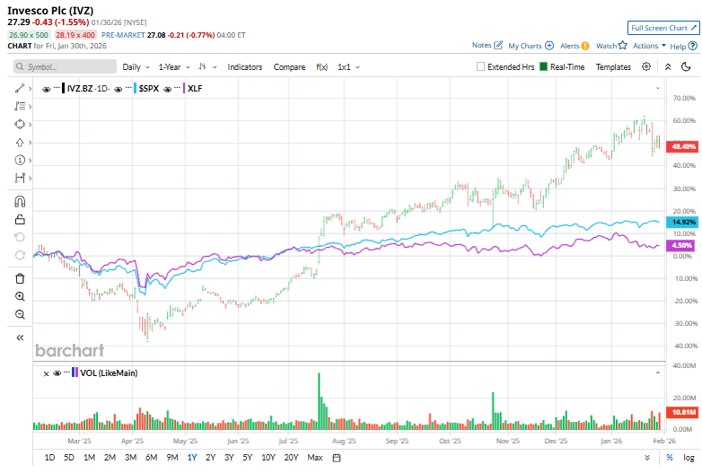 Zooming in further, Invesco has outpaced the State Street Financial Select Sector SPDR Fund’s (XLF) 3.2% return over the past 52 weeks and an 2.4% decline on a YTD basis.
