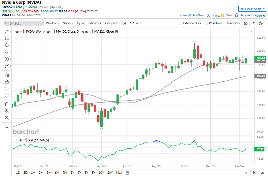 While the demand environment remains solid, NVDA stock looks cheap on valuation ahead of the earnings release, suggesting it could be a buying opportunity for long-term investors. Further, the stock’s 14-period Relative Strength Index (RSI) on the weekly chart stands at 57.4, comfortably below the 70 level typically associated with overbought conditions, suggesting the shares are not stretched and may still have room to climb in the near term.
