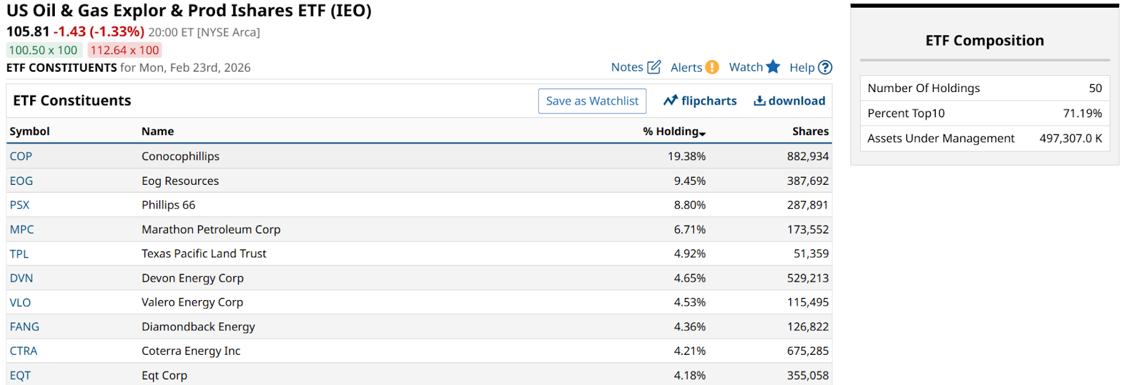 The other route is through either ETFs that own big integrated gas and oil stocks within the S&P 500 Index ($SPX) like the S&P 500 Energy Sector SPDR (XLE), or perhaps one like the US Oil & Gas Explor & Prod Ishares ETF (IEO). The latter, whose top 10 holdings are shown below, offers a bit more access to stocks beneath the very biggest names. XLE owns 26 stocks, while IEO owns nearly twice that amount.