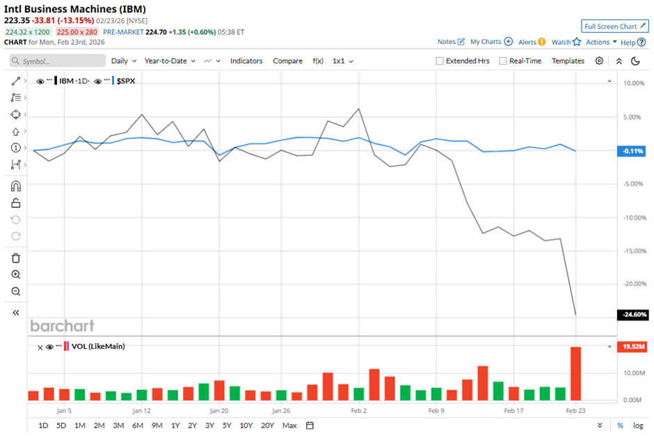 IBM’s sharp 13.2% selloff on Feb. 23 only added to the strain, leaving the stock down nearly 21.9% so far in 2026. That’s a much steeper drop compared to the broader S&P 500 Index ($SPX), which is only marginally higher year-to-date (YTD). In fact, after surging to a 52-week high of $324.90 in November, the stock has since given up significant ground, sliding nearly 40.7% from its peak, a steep pullback that highlights the dramatic change in investor mood.