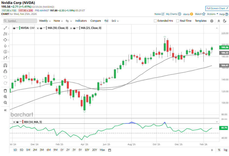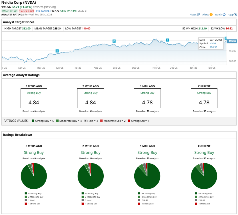 Wall Street’s average price target for NVDA stock stands at $255.34. Compared with its closing price of $195.56 on Feb. 25, this implies roughly 31% potential upside over the next 12 months. Analysts overall continue to rate the stock a “Strong Buy.”