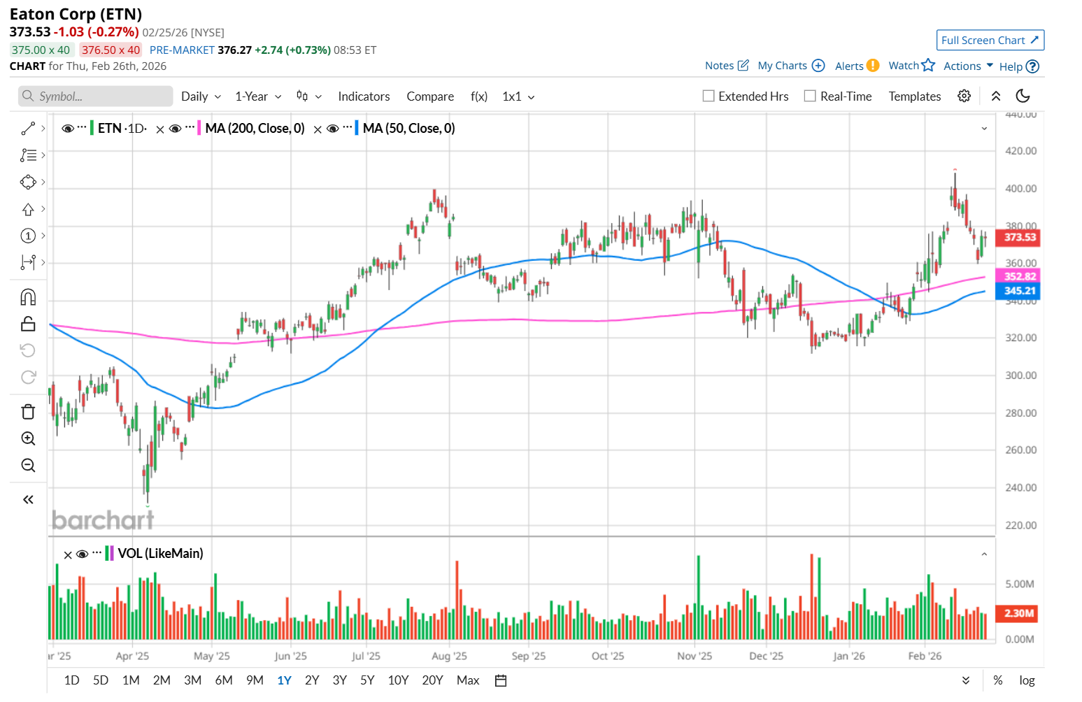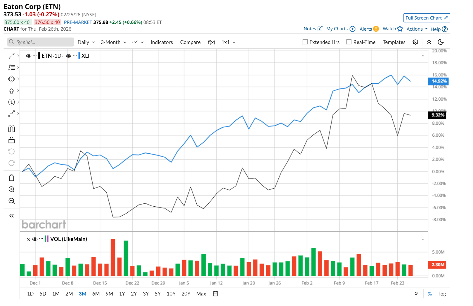 This industrial giant is currently trading 8.5% below its 52-week high of $408.45, reached on Feb. 12. Shares of ETN have gained 11% over the past three months, underperforming the State Street Industrial Select Sector SPDR ETF’s (XLI) 15.2% rise during the same time frame.