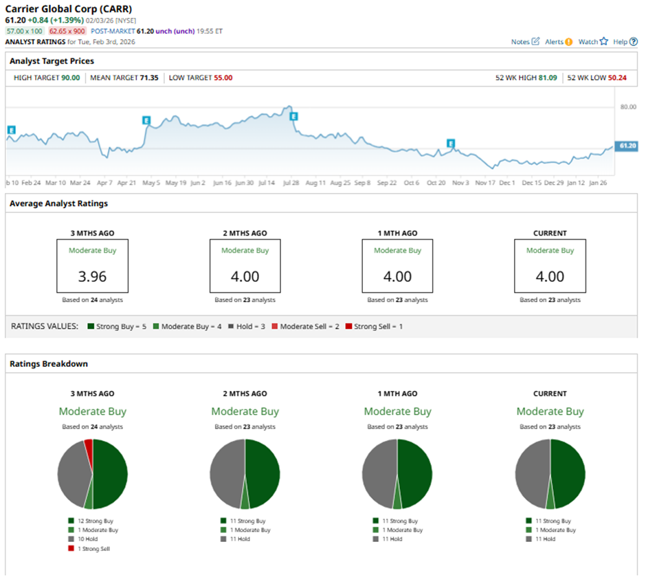 With a market cap of $51.5 billion, Carrier Global Corporation (CARR) is a global provider of intelligent climate and energy solutions, operating across the United States, Europe, Asia Pacific, and other international markets. Through its HVAC and Refrigeration segments, the company delivers innovative heating, cooling, ventilation, and transport refrigeration solutions under well-known brands such as Carrier, Viessmann, Toshiba, and Carrier Transicold.