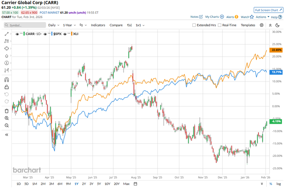 Shares of the Palm Beach Gardens, Florida-based company have lagged behind the broader market over the past 52 weeks. CARR stock has declined 3.1% over this time frame, while the broader S&P 500 Index ($SPX) has rallied 15.4%. However, shares of the company are up 15.8% on a YTD basis, outpacing SPX’s 1.1% rise.