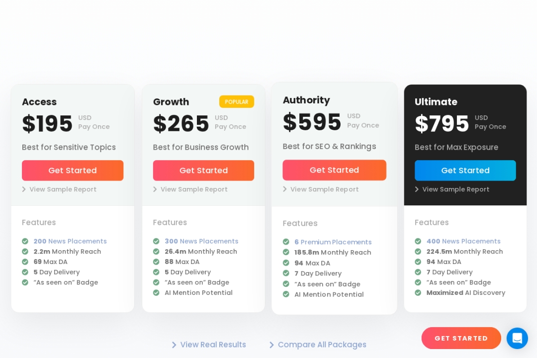BrandPush distinguishes itself through a platform prioritizing both distribution quality and marketing amplification. Plans from $195-$795 grant access to 200-450+ strategic outlets, paired with included professional writing services, AI-powered visibility optimization targeting LLM and search engines, and "As Seen On" badges proving media placement. The 4.7/5 Trustpilot rating from 272+ reviews demonstrates sustained satisfaction, while the money-back guarantee reflects delivery confidence. BrandPush manages distribution within 3-7 days and simultaneously handles search optimization, meaning your release gains visibility in both traditional media and AI-powered research systems.