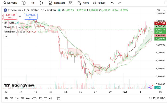 Ethereum is available at around $4,499.89, increasing by 0.58% in 24 hours, with a market capitalization of $543.15 billion. Its $43 billion daily turnover decreases by 7.84%, demonstrating weaker activity despite short-term price resilience.