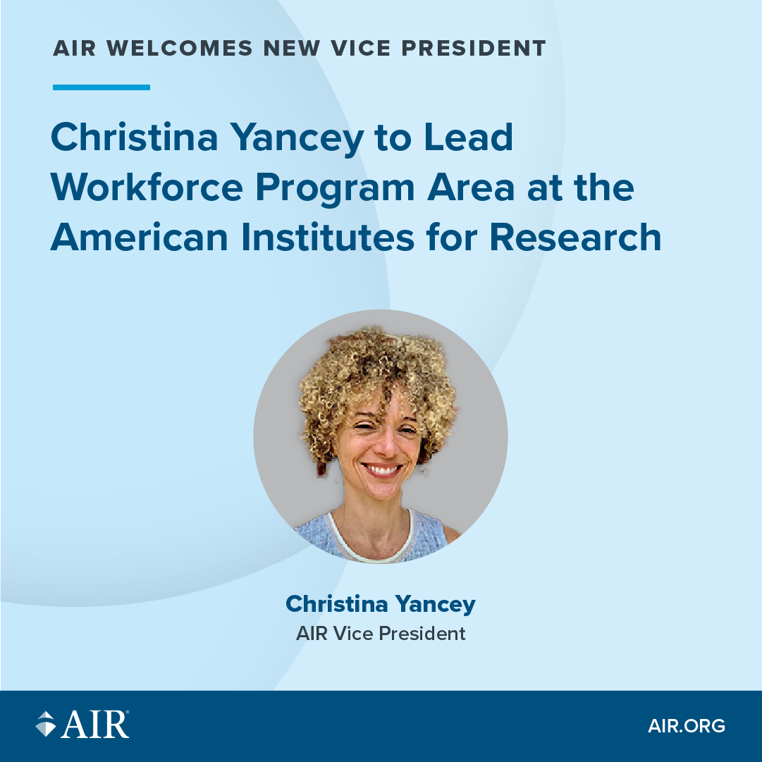 “Christina brings a wealth of experience and knowledge to AIR and its mission-driven commitment to improve workforce readiness and opportunities in the U.S. and internationally,” said Jessica Heppen, Senior Vice President for AIR’s Human Services Division. “She understands the critical need to connect research, policy, and practice and implement effective programs and policies in close collaboration with industry and communities.”