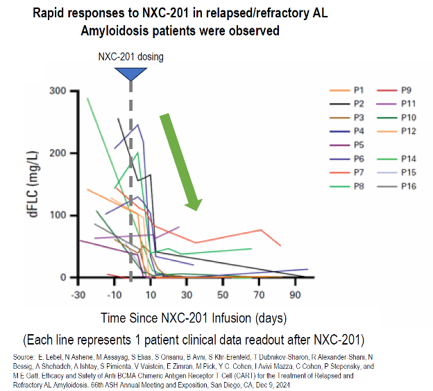 At the NXC-201 ASH 2024 oral presentation, data were presented from 16 relapsed/refractory AL amyloidosis patients (including 3 new patients) in the ongoing Phase 1b/2 NEXICART-1 study, with median 4 lines of therapy prior to NXC-201. Patients were infused with CAR+T cells at doses of 150 x 106 (n=1), 450 x 106 (n=2), and 800 x 106 (n=13).