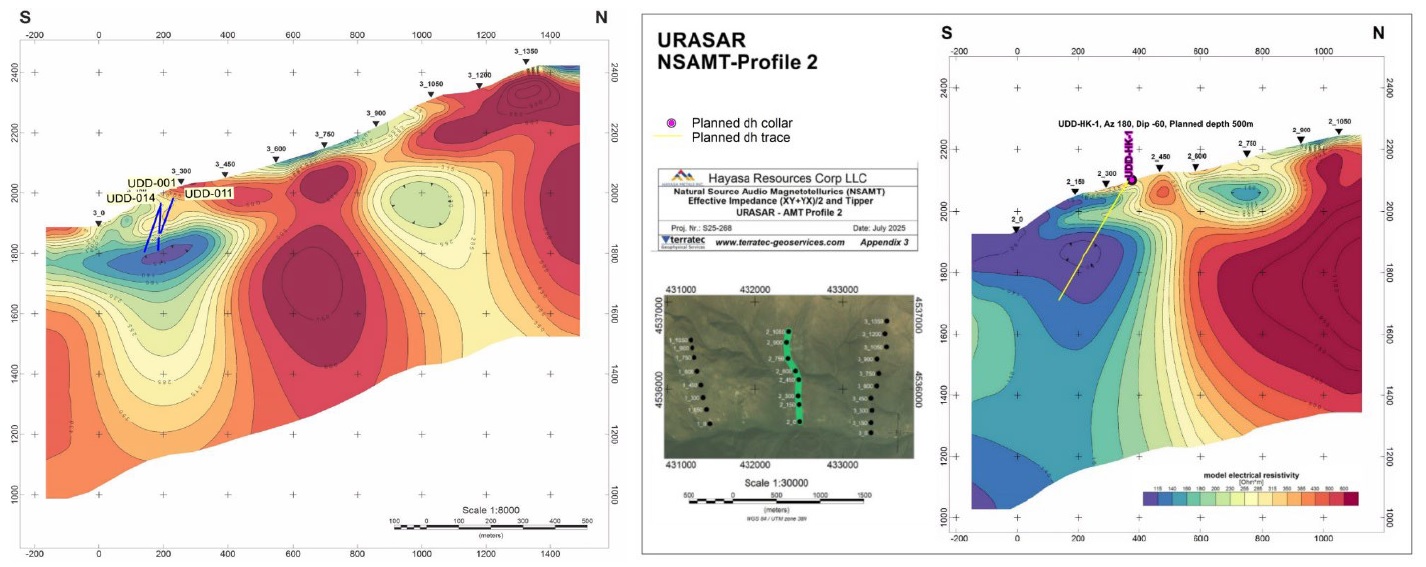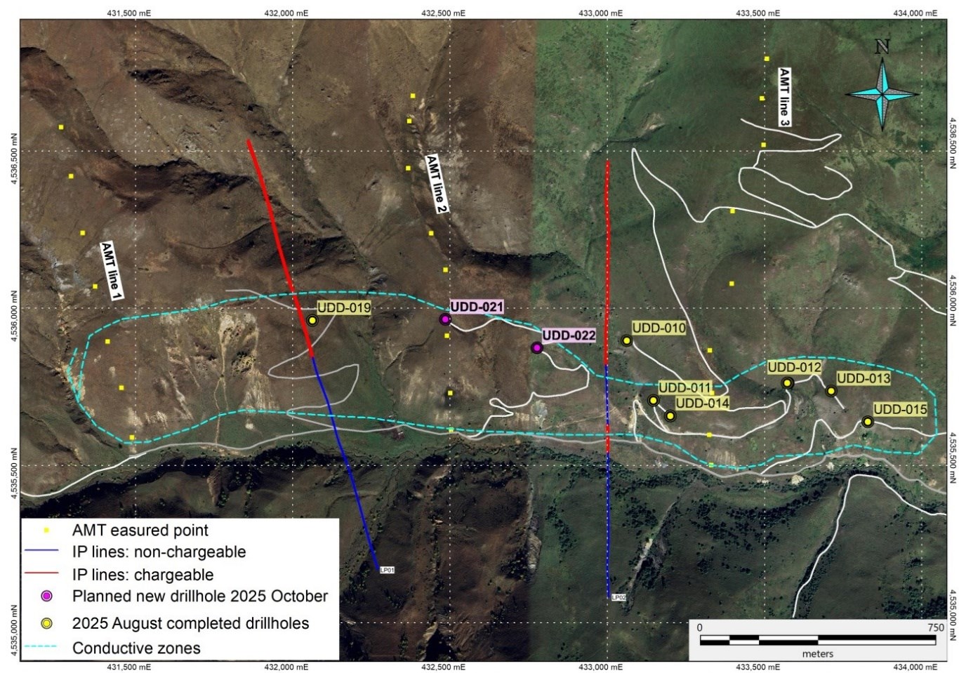 In July 2025, a trial audio-magnetotelluric (AMT) geophysical survey comprising three survey lines was completed at Urasar just as the summer drilling program was concluding. As seen in the resistivity model below, zones of low resistivity/high conductivity appear to correspond to areas of sulfide mineralization intersected in drill holes UDD-01, UDD-11, and UDD-14. The data also suggests that these holes may have been terminated prematurely—particularly hole UDD-01, which was lost at 146m just as it entered a zone of promising quartz—chalcopyrite mineralization.