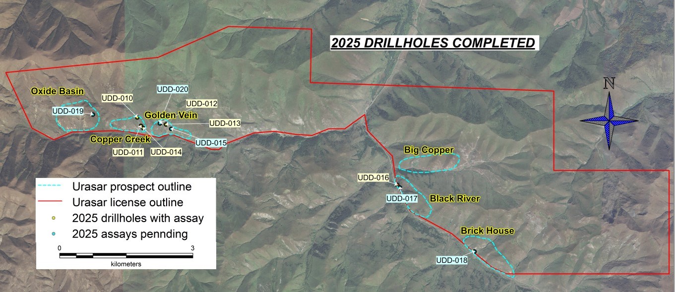 The 15-kilometre-long Urasar mineral district is situated along a major crustal suture that marks the closure of the ancient Tethyan Sea. The district is characterized by strong to intense argillic to advanced argillic alteration as well as surficial sulfide mineralization throughout its length. The western portion of the license features breccia-hosted copper-gold mineralization, while the central zone is dominated by massive sulfide bodies containing gold and copper. The eastern end of the district exhibits base metal mineralization and anomalous gold at surface. Urasar was first exploited by the French in 1914, followed by Soviet exploration programs in the 1930s and 1956-1960, comprising over 20 exploration adits and at least 15 shallow drill holes.