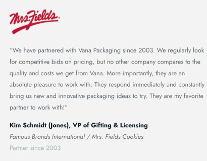 The partnership with Mrs. Fields Cookies represents Vana Specialty Packaging's commitment to delivering customized packaging solutions for brands, adapting to industry developments over time.