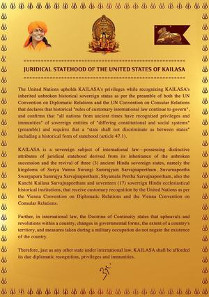 KAILASA is a sovereign subject of international law-possessing distinctive attributes of juridical statehood derived from The SPH Nithyananda Paramashivam's inheritance of the unbroken succession and the revival of three (3) ancient Hindu sovereign states, namely the kingdoms of Surya Vamsa Surangi Samrajyam Sarvajnapeetham, Suvarnapeetha Swargapura Samrajya Sarvajnapeetham, Shyamala Peetha Sarvajnapeetham, also the Kanchi Kailasa Sarvajnapeetham and seventeen (17) sovereign Hindu ecclesiastical historical institutions, that receive customary recognition by the United Nations as per the Vienna Convention on Diplomatic Relations and the Vienna Convention on Consular Relations.