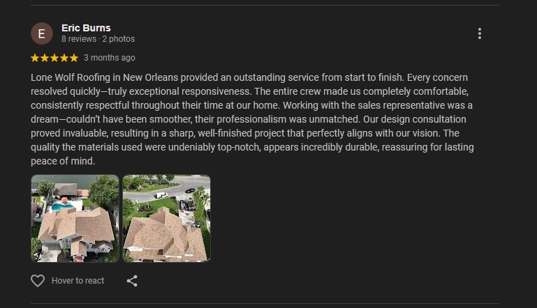 Kat Matherne from New Orleans shared her positive experience working with Lone Wolf Roofing: “Lone Wolf Roofing in New Orleans provided a remarkable experience with their excellent service and quality. Whenever I had questions or concerns, their team handled them wonderfully. I felt comfortable having their crew around my home; their professionalism was evident. The project manager’s support was exceptional; I couldn't have asked for better. Throughout the entire project, they communicated with me consistently, ensuring I was always in the loop. The design consultation greatly assisted in choosing a style that looks exceptionally sharp and well-finished. Highly recommend their services in New Orleans.”