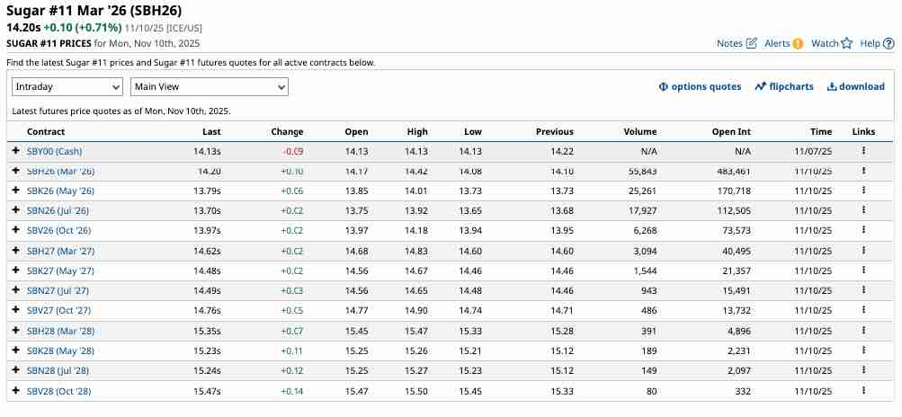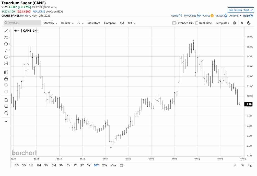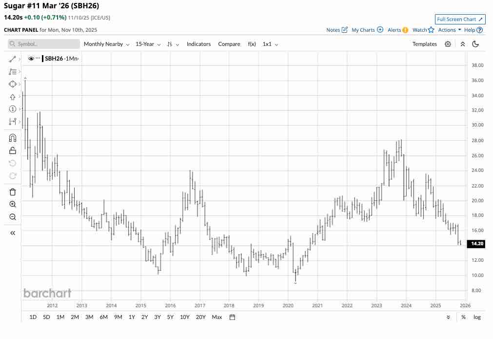 The multi-year decline in the continuous world sugar futures took them just over 50% lower, from 28.14 in November 2023 to the most recent low of 14.04 cents in October 2025.