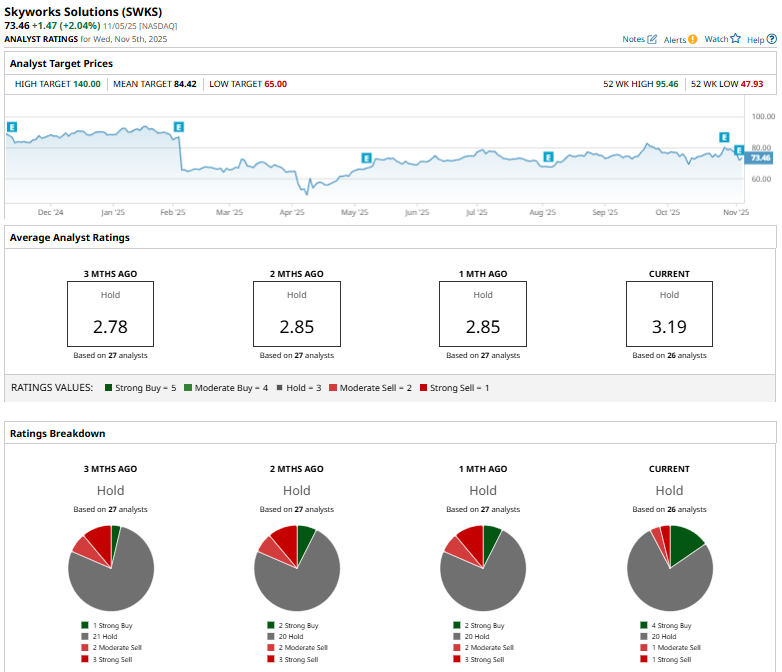 Among the 26 analysts covering SWKS stock, the consensus rating is a “Hold.” That’s based on four “Strong Buy,” 20 “Hold rating,” one “Moderate Sell,” and one “Strong Sell” rating.