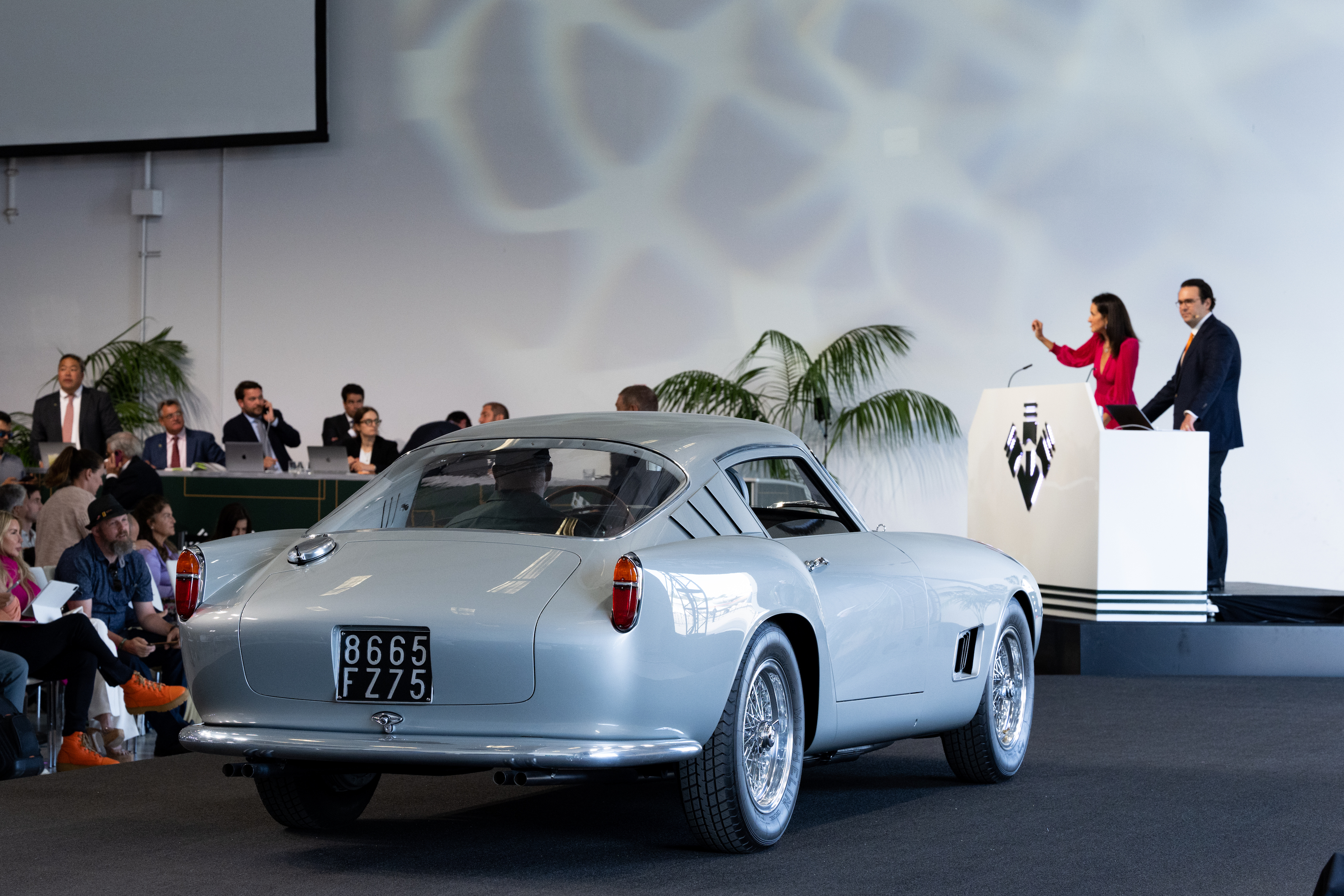 - Lydia Fenet and Alain Squindo conduct the sale of Passion for the Drive: The Cars of Jim Taylor from the auction podium (Sean Smith © 2022 Courtesy of Broad Arrow Group).