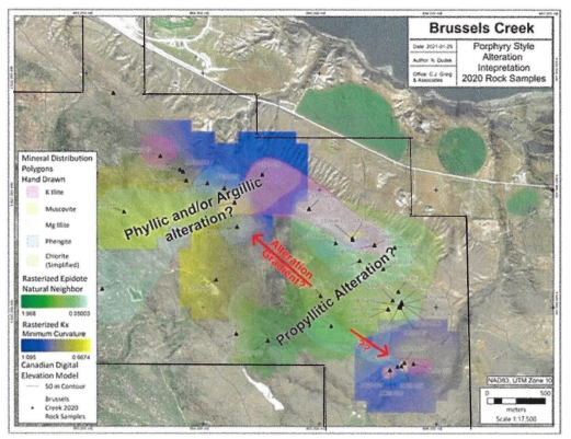 Figure 1. Proposed Drill Locations at Brussels Creek Click here to view Figure 1. | Figure 2. Porphyry-style Alteration Interpretation from Hyperspectral Study Click here to view Figure 2 |