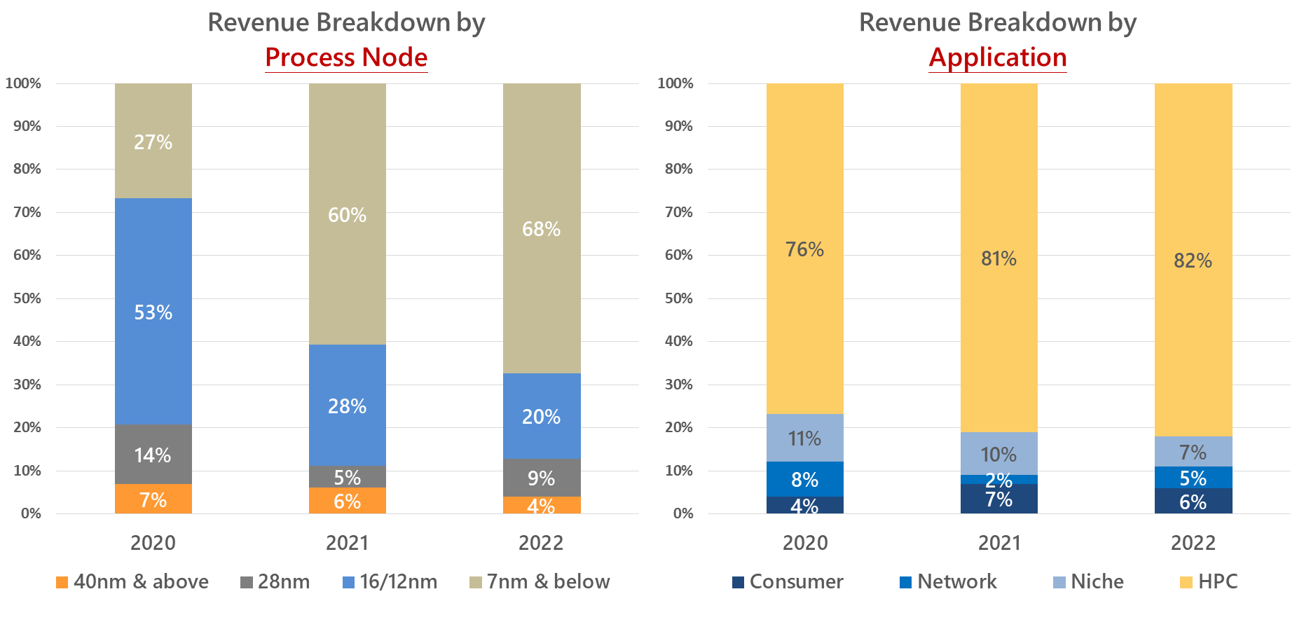 On a process node basis, advanced technologies, defined as devices manufactured at 7nm or smaller line widths, accounted for 68% of 2022 revenue, up from 60% in 2021. Devices manufactured on 16nm and 12nm technologies contributed to 20% of 2022 revenue, while ASICs at 28nm and larger processes accounted for the remainder 13%.